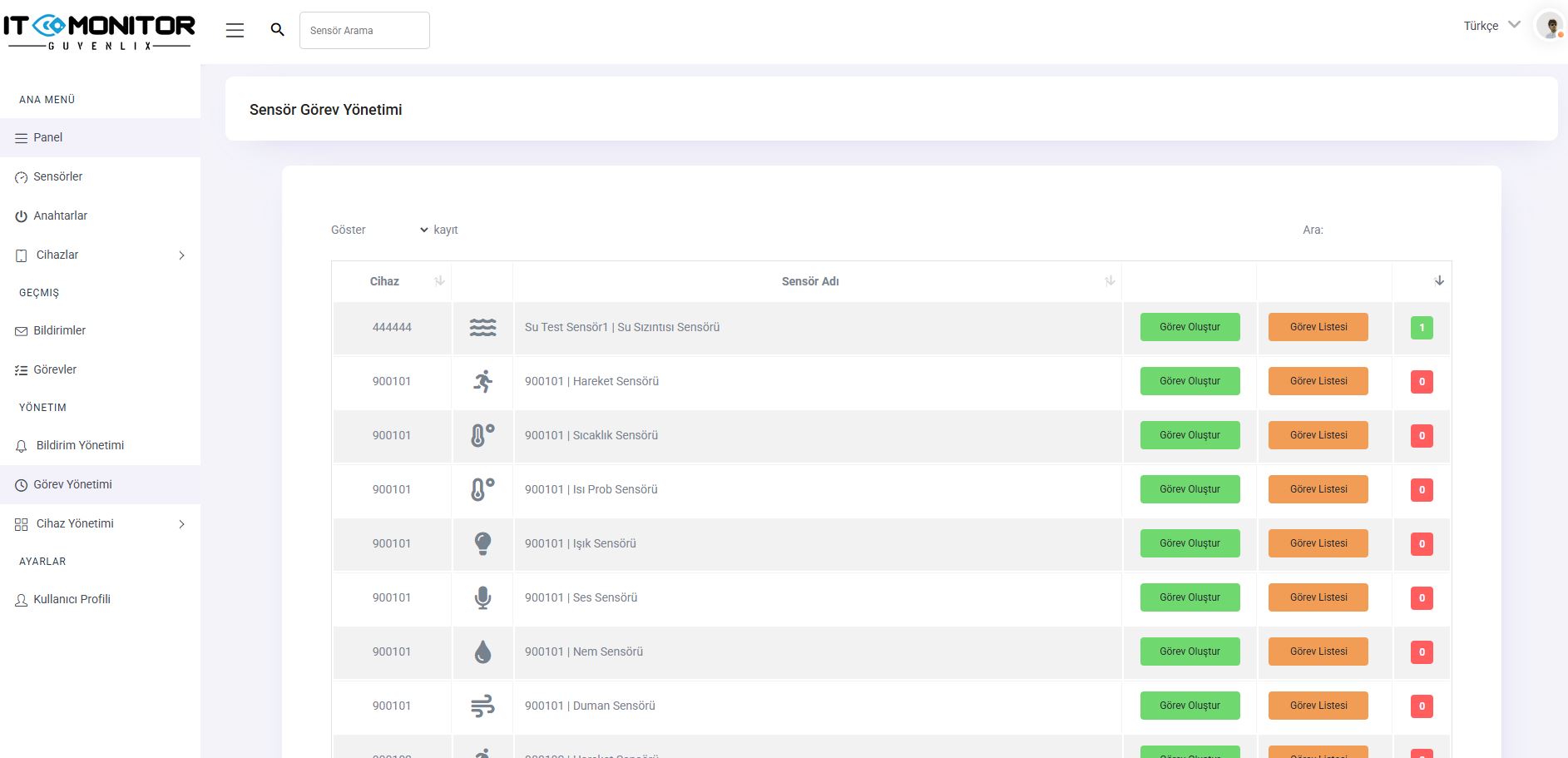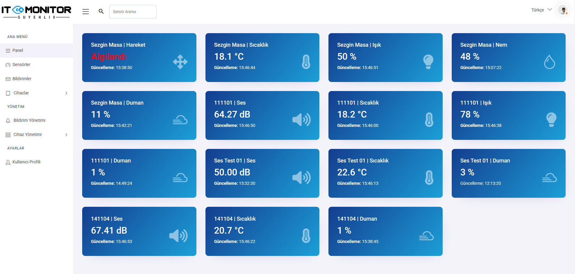 Yönetim panelinizin ana ekranında, cihazınızdaki sensörlerin anlık verilerini gösteren kartlar yer alır. Bu panel, sıcaklık, nem, ışık, hareket ve daha fazlasını takip ederek cihazınızın performansını gerçek zamanlı olarak izlemenize olanak tanır. Verilerin her an güncellenmesi sayesinde, sistemin durumunu her zaman kontrol edebilir ve gerekli ayarları hızlıca yapabilirsiniz.