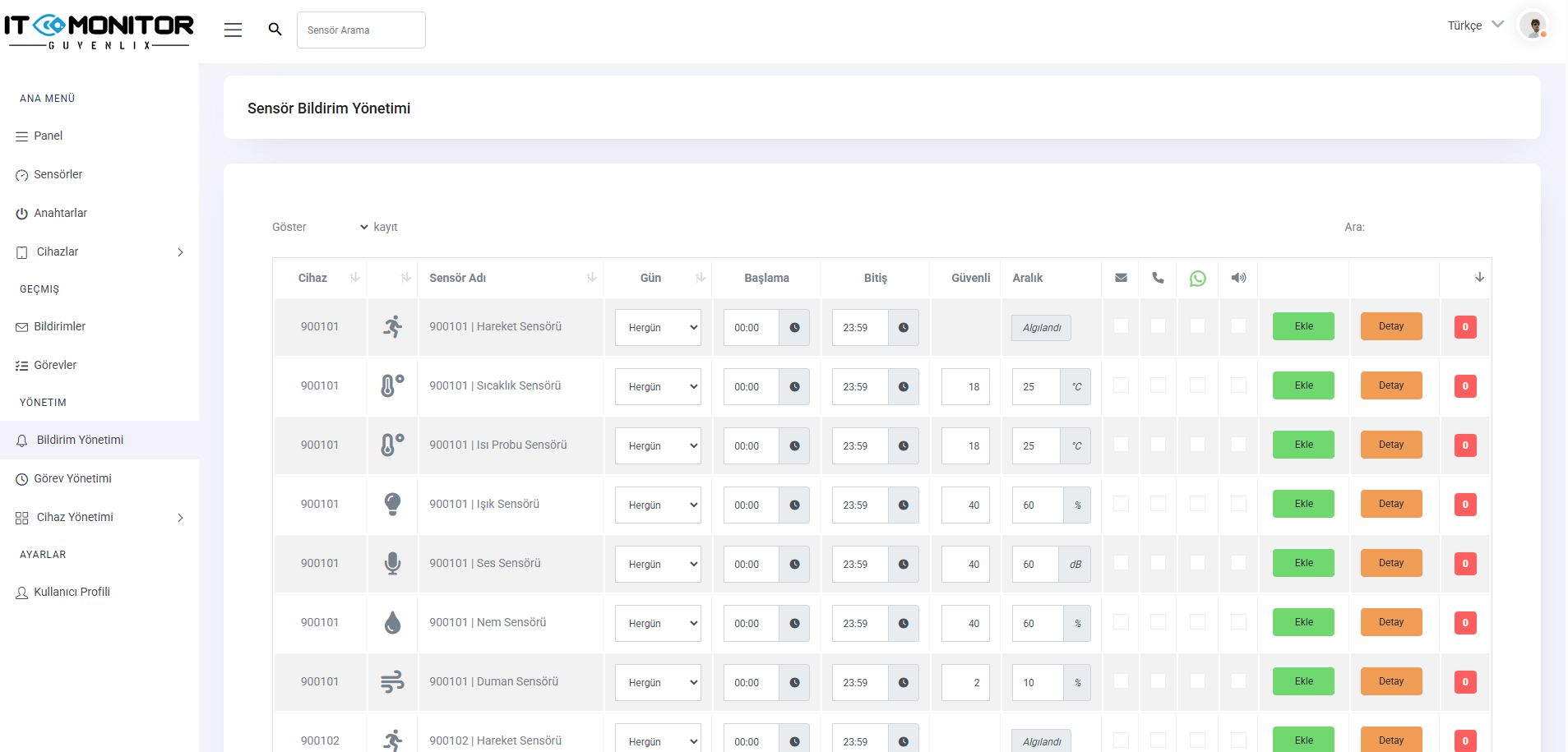 Bildirim yönetim paneliniz, her sensör için özelleştirilmiş bildirim seçeneklerini sunar. Anlık değişikliklerde, e-posta, sesli arama, WhatsApp mesajı ve ikaz sesi bildirimleriyle hemen bilgilendirilirsiniz. Bu panel, cihazınızdaki sensörlerin durumunu izlerken, kritik olaylara hızlı ve etkili bir şekilde yanıt vermenize olanak tanır. İhtiyacınıza göre bildirim yöntemlerini seçebilir ve sisteminize en uygun olanı aktif hale getirebilirsiniz.
